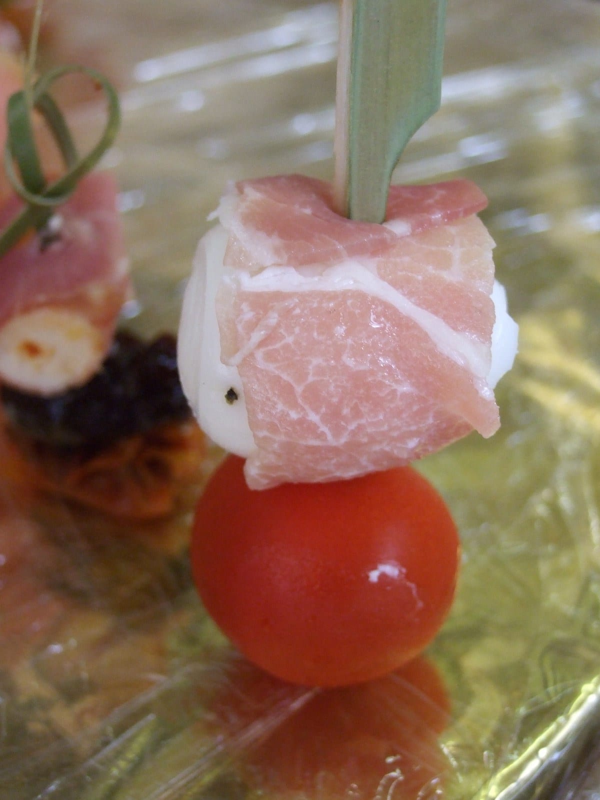 Oeuf de caille durci roulé dans une tranche de jambon de bayonne et tomate cerise